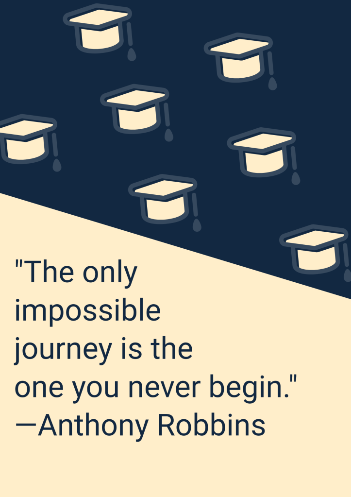 Remember that you are now starting the journey of a new beginning, a new chapter in life that needs to be written. You’re now off to meeting new people, finding yourself a job and doing things different to what you’re used to. But keep in mind that nothing’s wrong if you feel afraid of those things, what’s wrong is letting it stop you from doing things.